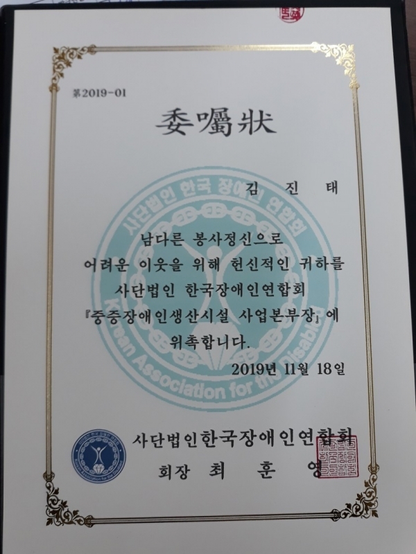 [191223]중증장애인 생산시설 사업추진본부장 임명장