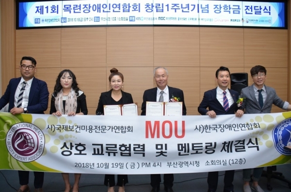 사)국제보건미용전문가연합회 와 사)한국장애인연합회는 기술증진 및 소외계층의 복지향상을 위하여 양 기관은 다음과 같이 상호 협력하였습니다. 소위계층의 보건미용분야의 사회복지활동을 지원하고 나아가 안정적인 사회활동에 필요한 기술증진에 적극 동참하는데 그 목적을 둡니다.